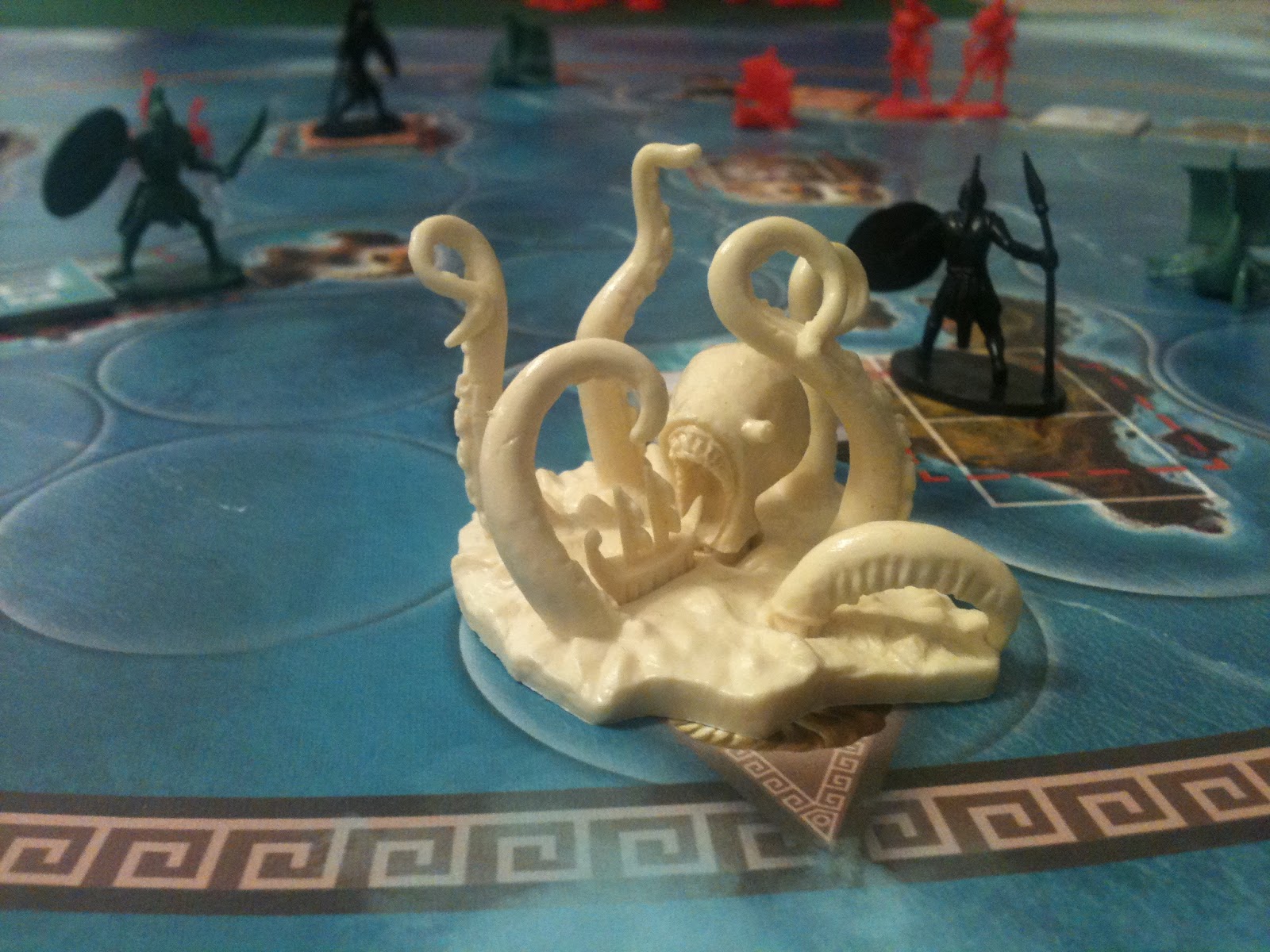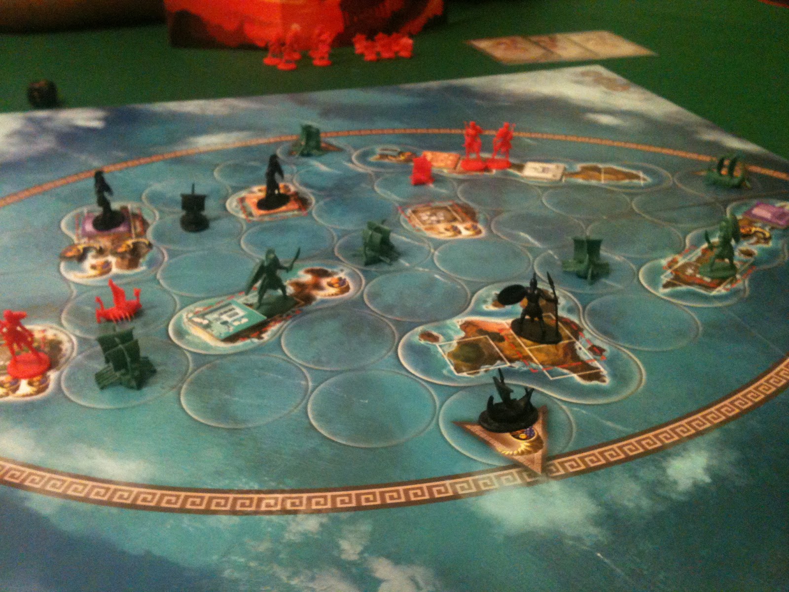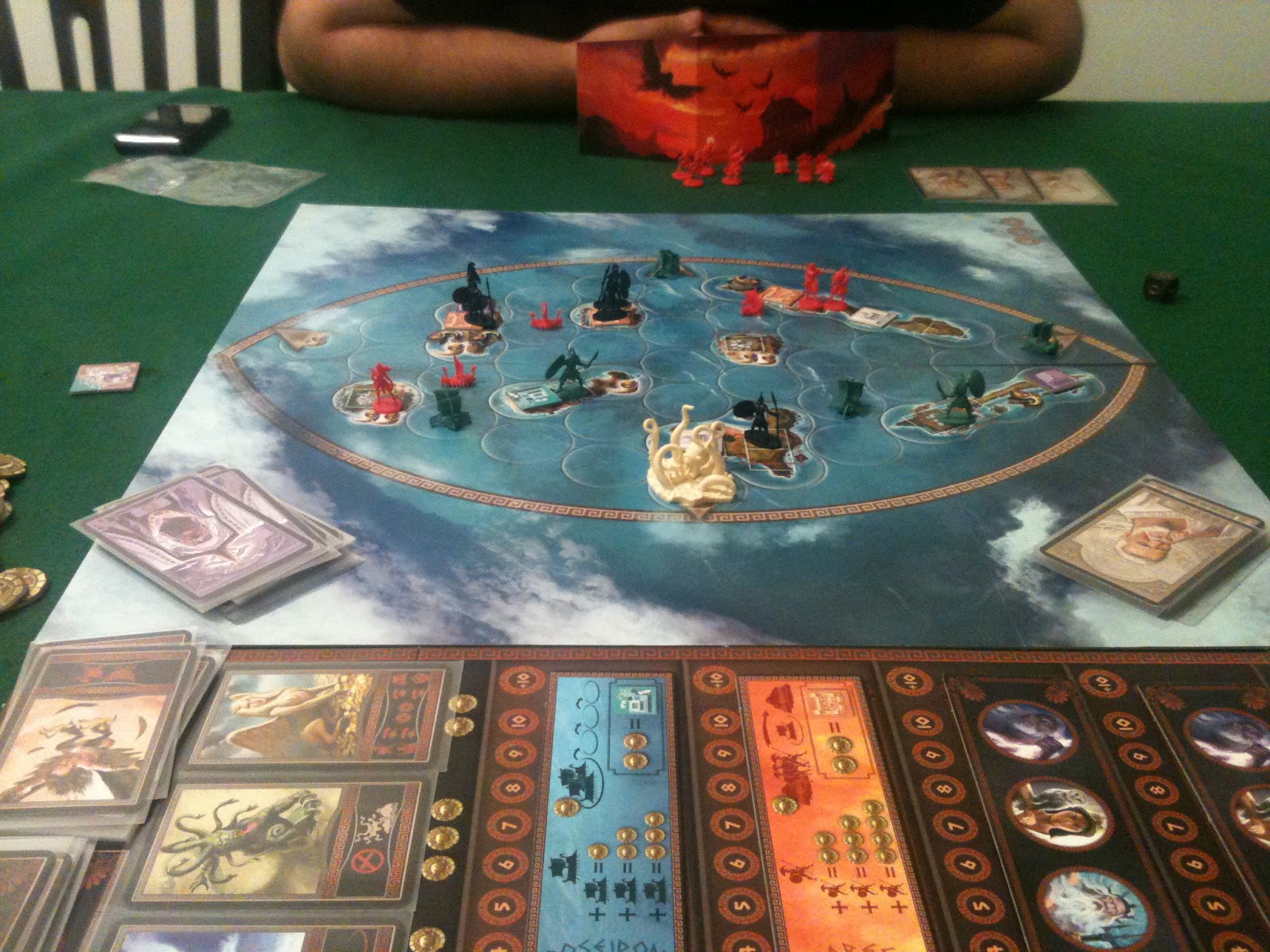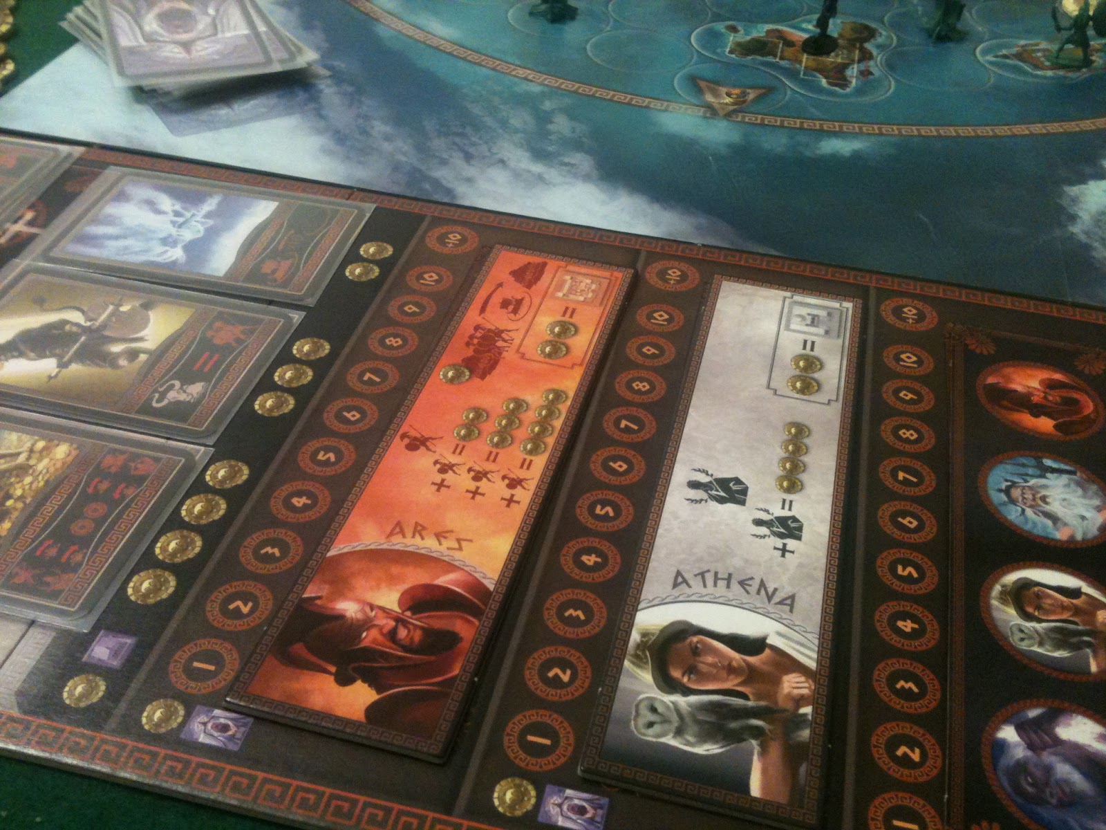 O tabuleiro possui duas faces que são montadas conforme a quantidade de jogadores. Ela possui uma visão aérea das ilhas de Cyclades, como se os deuses estivessem olhando para baixo a partir do Monte Olimpo. Muito legal.