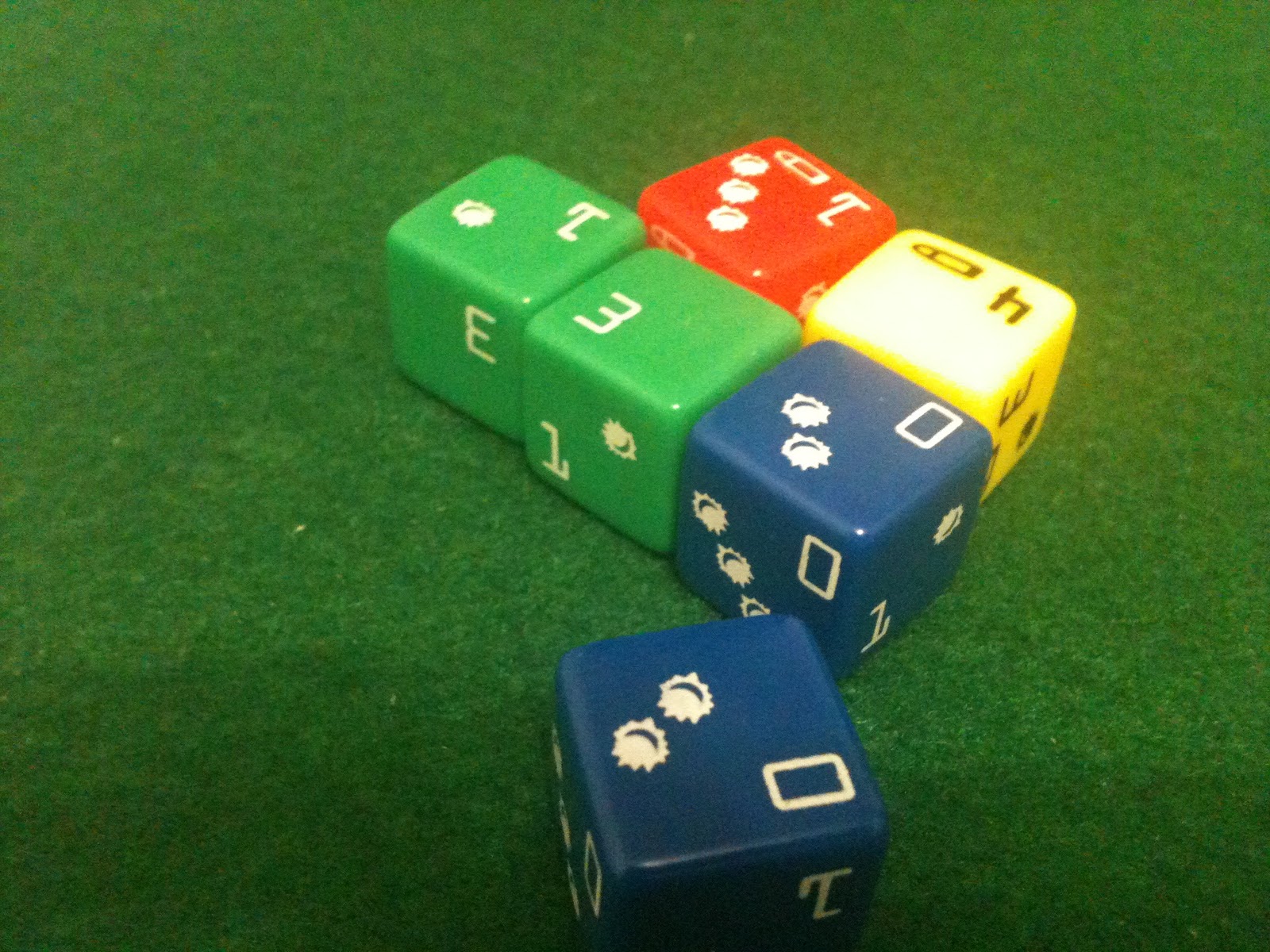 Ademais, os dados são uma porcaria - não são entalhados, e sim, pintados e tinta sai fácil, com poucos jogos. E encontrar reposição onde, né? Eu imprimi um folha adesivo com as faces dos dados e colei nas faces.