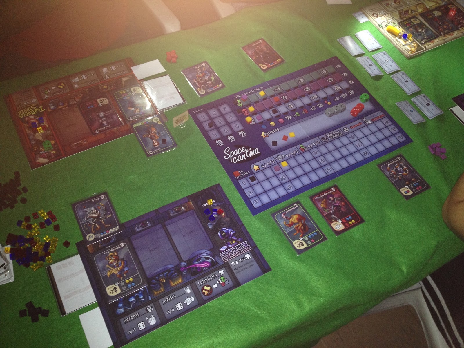 Na escolha das cartas, os garçons são usados para adquirirmos os ingredientes para os pratos, os clientes são os famintos que precisam ser atendidos, e os dados servem para dar o "trigger" nas cartas previamente selecionadas.