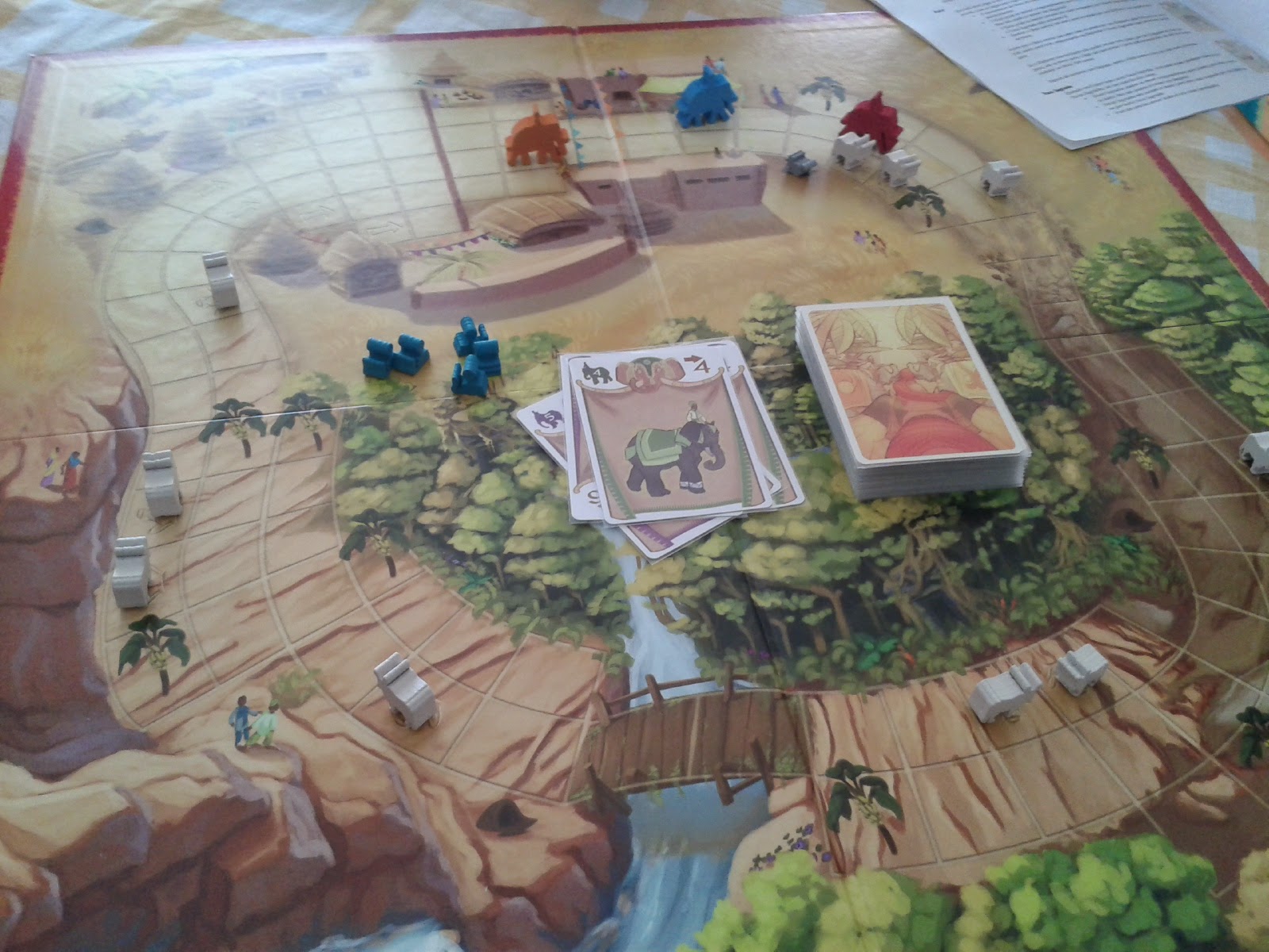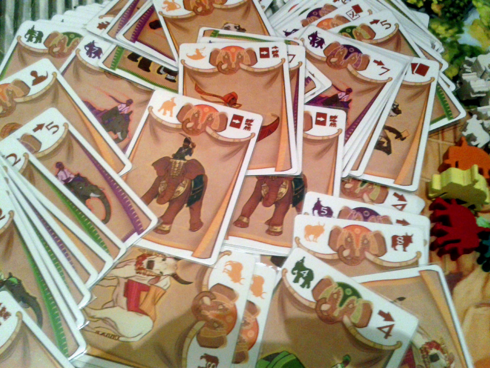 Outro ponto bacana do jogo são as cartas de efeito : temos o rato que faz os elefantes retrocederem, temos as cobras que reduzem o "hand-limit", a prece que compra carta do descarte, o tapete mágico que faz os elefantes passaram por cima e outras cartas que tornam o jogo divertido.