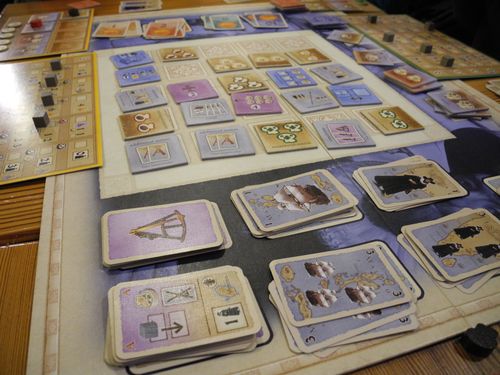 Tabuleiro central com as cartas e os tiles. Foto BGG.