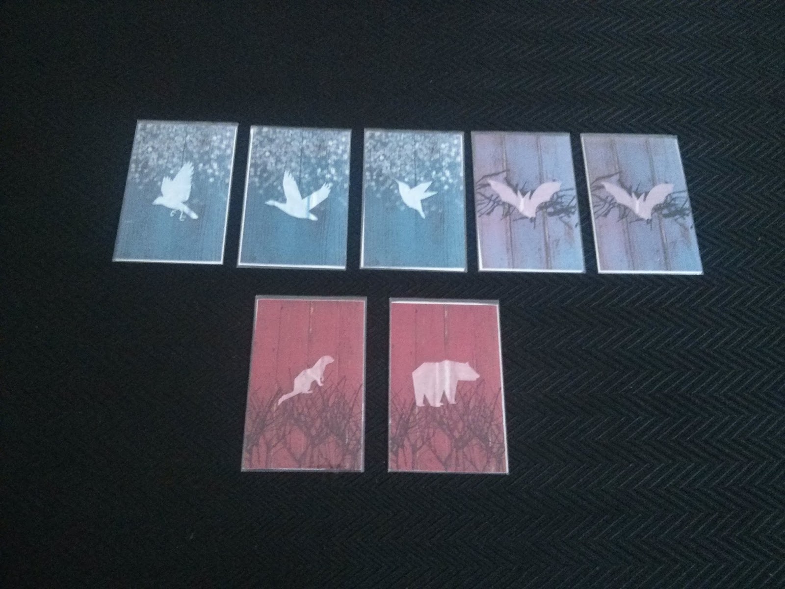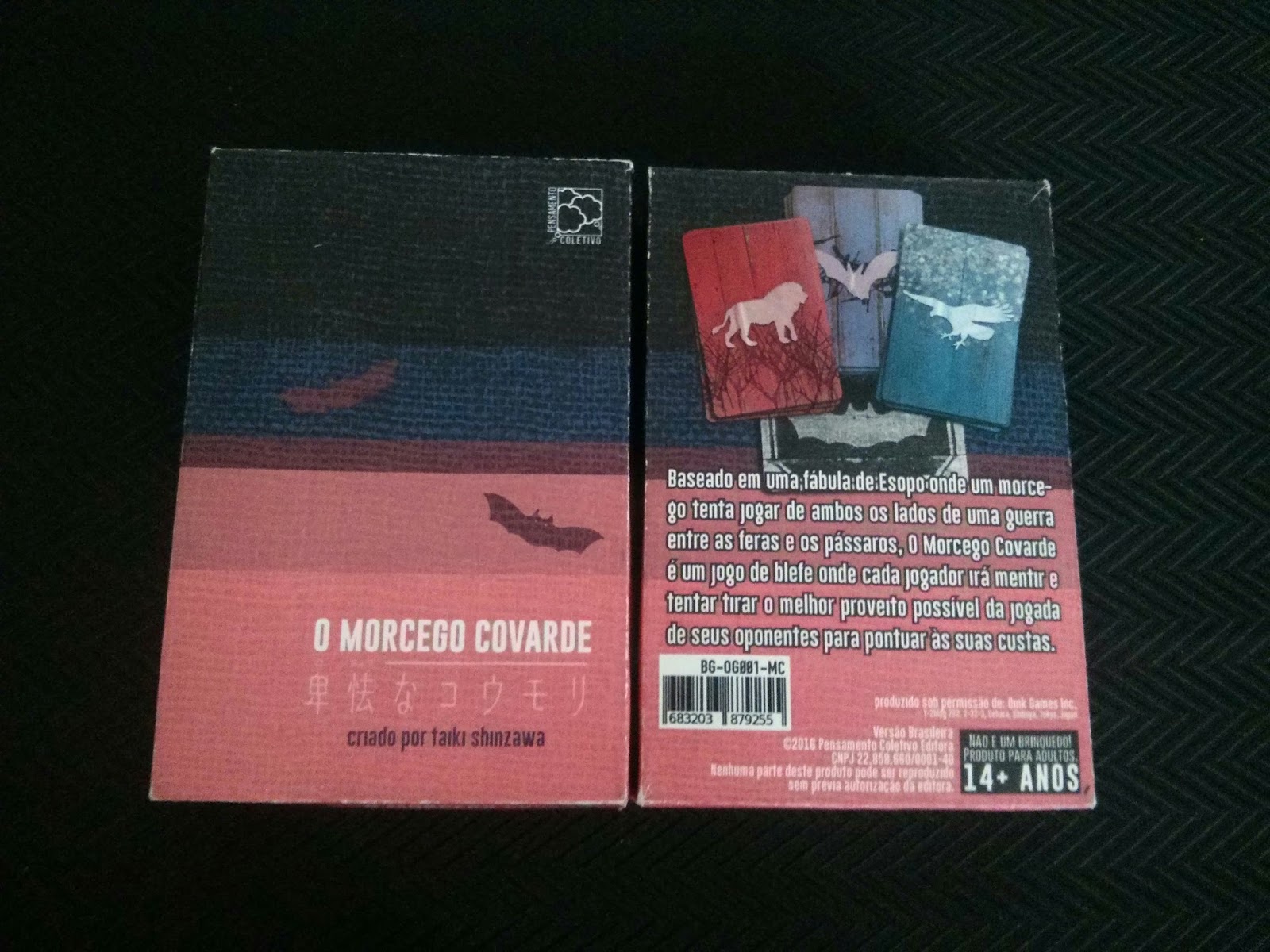 Usando os elementos dessa fábula de Esopo, o game designer Taiki Shinzawa criou o jogo de blefe Hikyõ na Komori, lançado pela Oink Games em 2012 e que está sendo trazido ao Brasil pela Pensamento Coletivo como O Morcego Covarde, o primeiro lançamento da linha Microbox da editora. Parece que a ideia é desenvolver várias linhas diferentes com base no tamanho dos jogos, algo que está se mostrando uma tendência lá fora e agora também aqui no Brasil. Acho que as pessoas gostam de guardar seus jogos numerados na estande. Ano passado, a Pensamento Coletivo começou com a linha Smallbox lançando Gunrunners, um jogo que saiu com excelente qualidade; e que nos faz esperar o mesmo de O Morcego Covarde. Digo isso porque a cópia que está comigo não é a versão final, apenas um protótipo para demonstração.