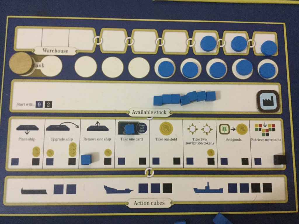 A) ARMAZEM: a primeira linha, para se armazenar as mercadorias obtidas durante o jogo. O limite são os espaços vazios, que no caso do início, só há 2 espaços. Se consegue mais espaços a medida que for fazendo a ação de COLOCAR BARCOS no tabuleiro, na caixa de BARCOS DE GUERRA.