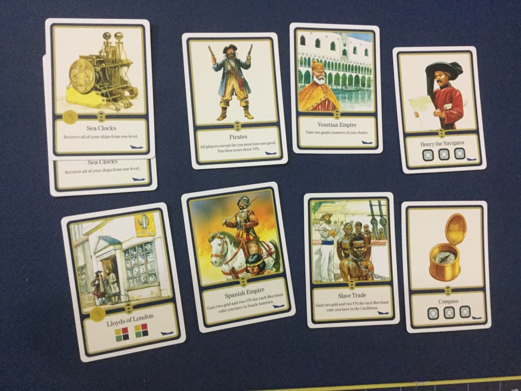 O tabuleiro principal do jogo tem um caminho dividido em quadrados, simbolizando as Eras dos Navios. Começa na 2ª Era, até a 11ª, e cada era tem 2 quadrados (tipos de barcos Mercantil e Guerra).