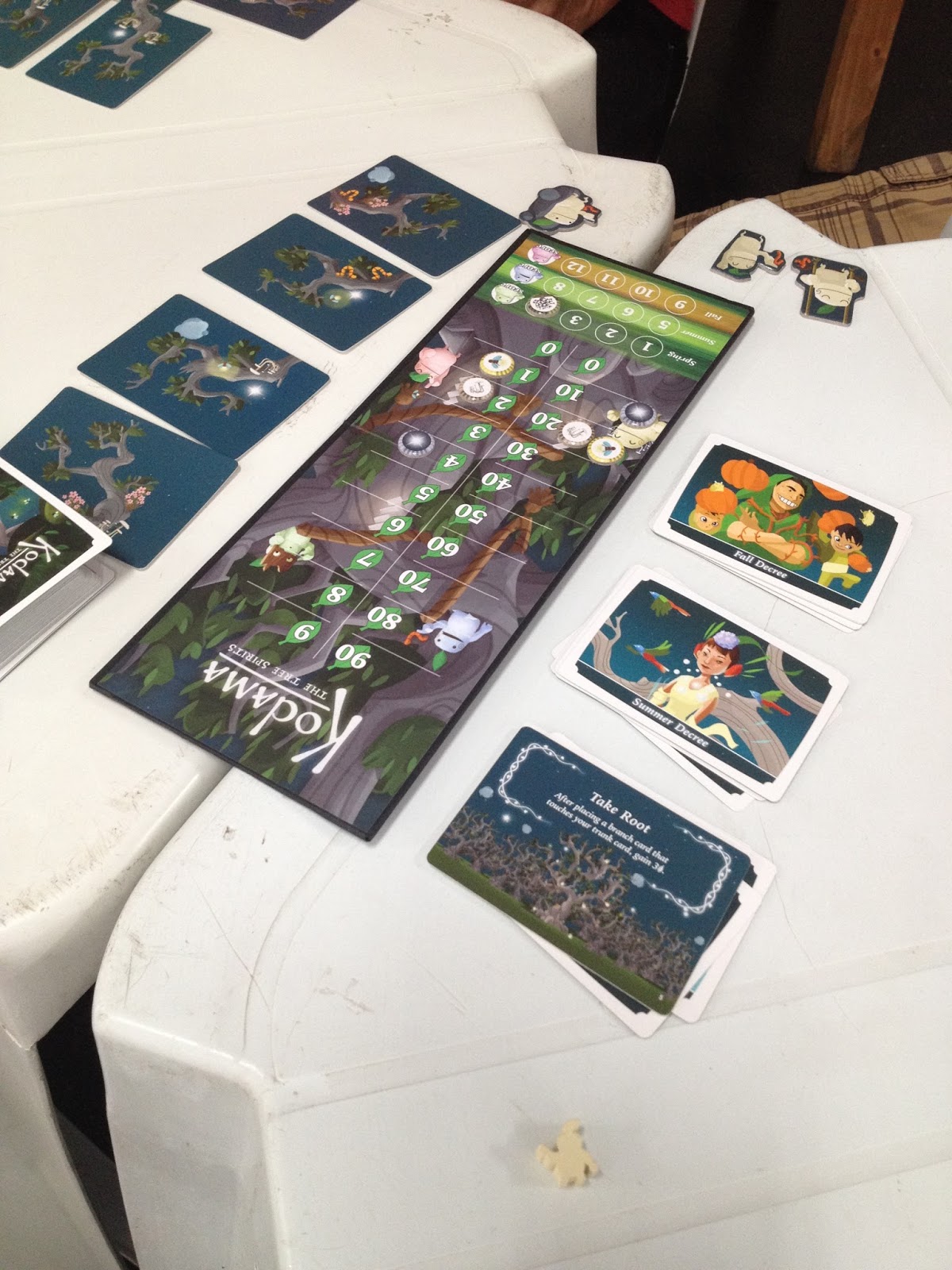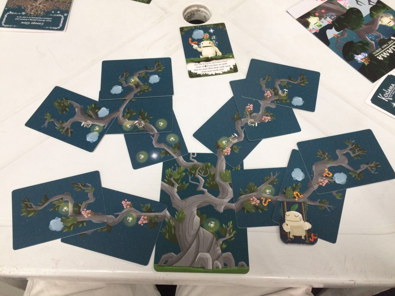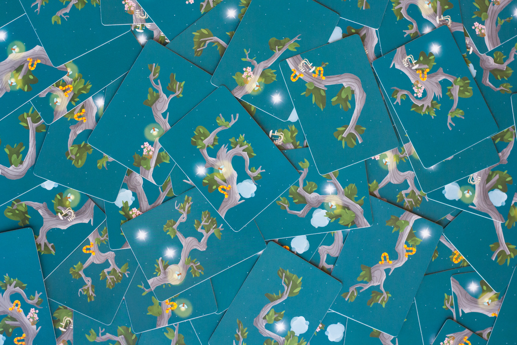 Ao colocar uma carta (galho) você pontua pelos símbolos que descem pelas outras cartas e depois dessas quatro fases temos uma pontuação especial com as cartas de Kodama (que pontuam por determinadas estruturas dentro da árvore).