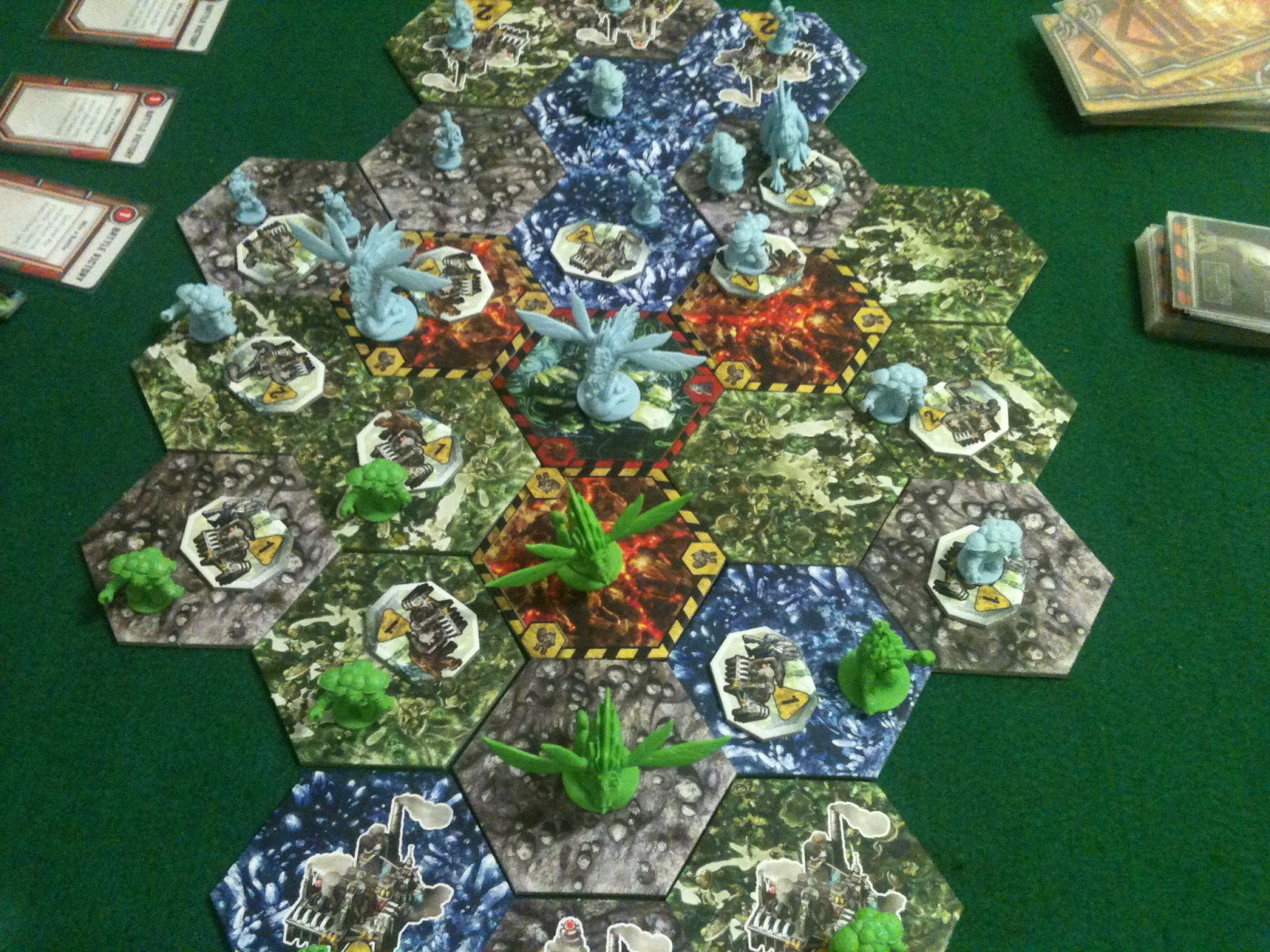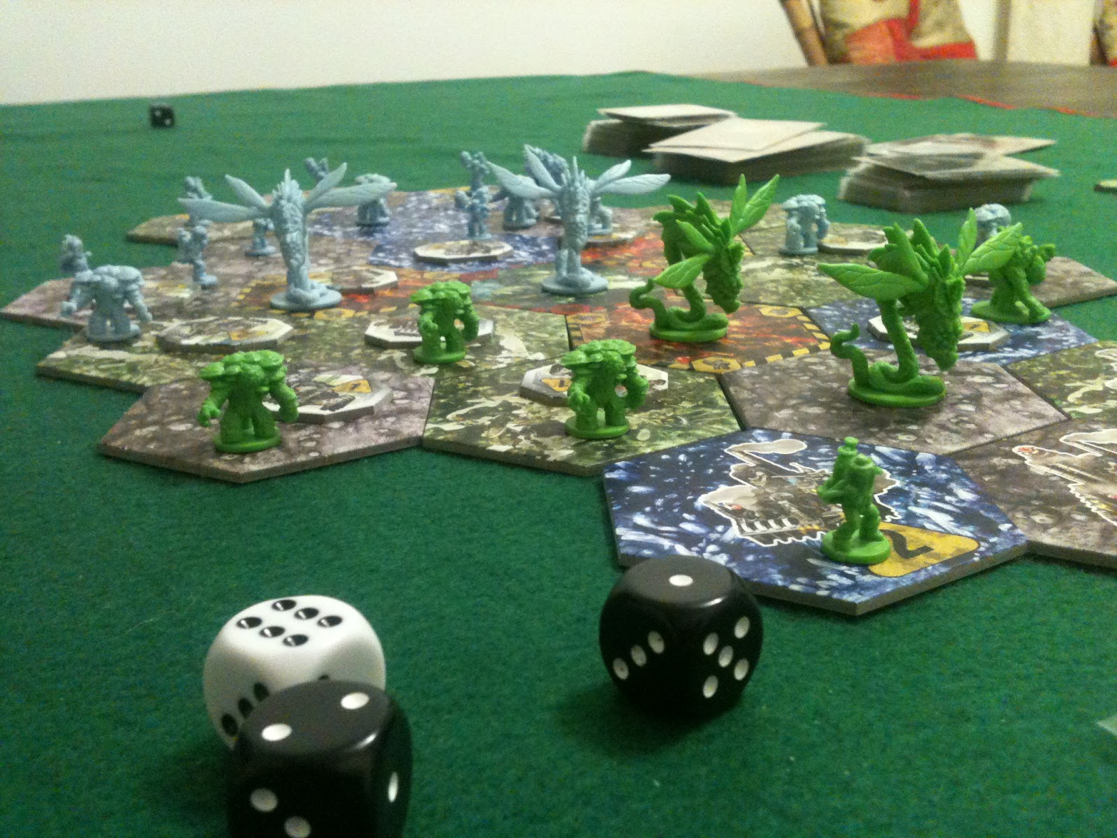 As regras são bem simples e o jogo preza o combate.  E nosso combate aconteceu após a terceira rodada, e o tabuleiro é preenchido com as miniaturas de formas estranhas.