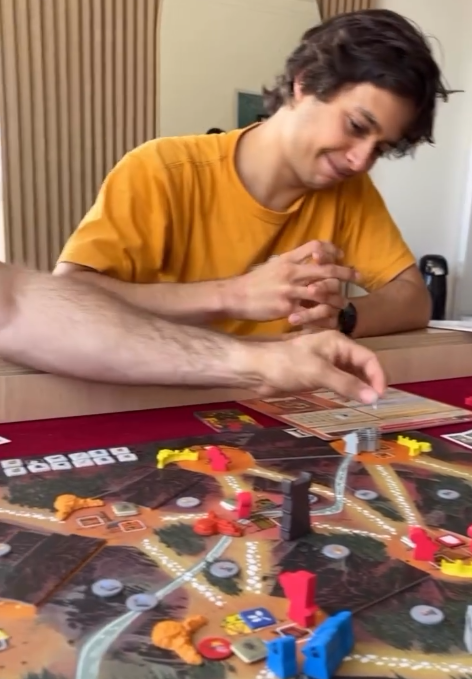 Sendo um jogo com características semi-coop, onde os jogadores se ajudam a construir trilhos e estações, eu fui bem burro e joguei sozinho em um canto do mapa enquanto Siri e Menino jogaram juntos do meio para o fim dos trilhos. Jogo interessante, mas talvez seja para jogar em 4p para ter essa pressão