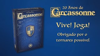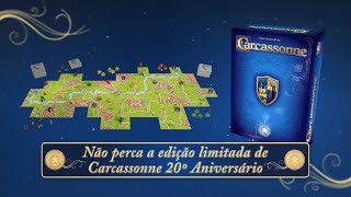 O clássico jogo Carcassonne está comemorando 20 anos, e traz uma edição especial para os fãs. Inclui o jogo básico e as expansões O Abade e O Rio mais 20 peças totalmente inéditas.